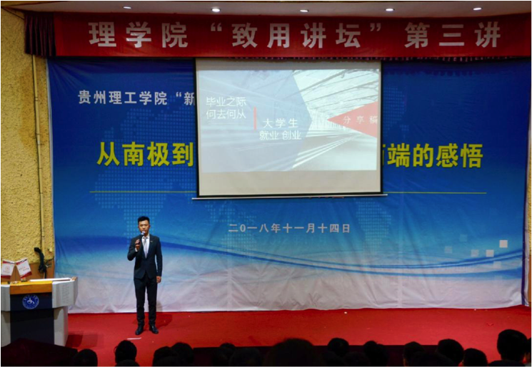 本次讲座邀请了贵州省青年企业家——贵州黔房筑梦房地产经纪有限公司总经理袁野为主讲人。袁野通过分享自己大学毕业之后从就业到创业的经历,作了题为“何去何从?—我的创业过程中的苦与乐”的精彩演讲。