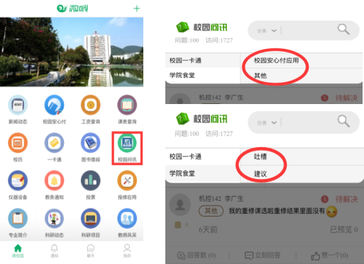 该平台通过易班、微哨及微信三个窗口进行运作,利用信息的便捷性高效性,将食堂食品安全的问题及时进行反映,可杜绝反映滞后的弊端。以下以微哨平台为例,通过微哨平台中校园问讯窗口可以吐槽,可以建议,可以对校园安心付应用功能提出需求。