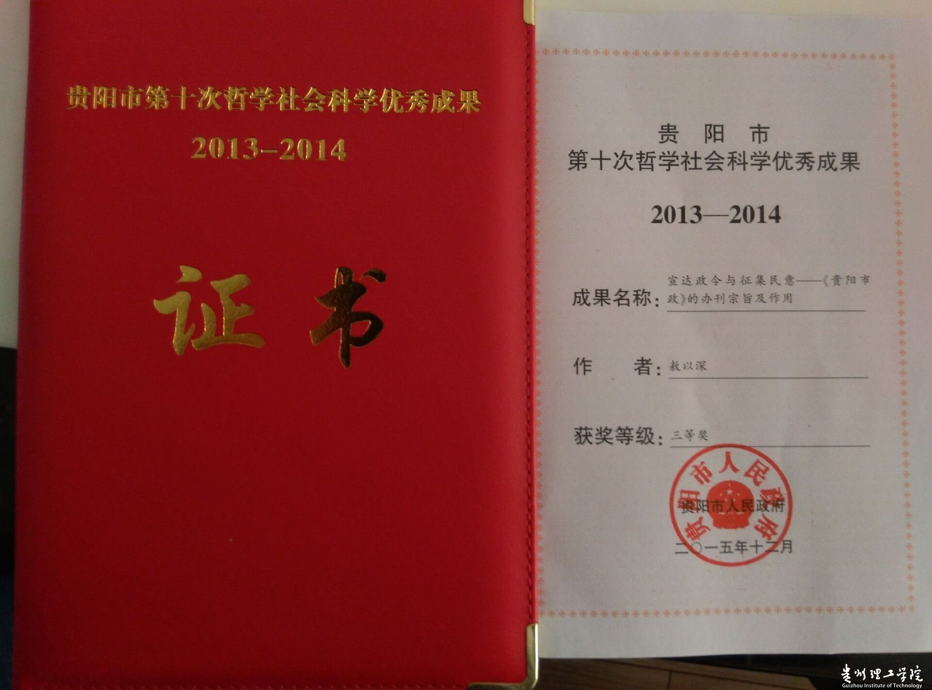 本网讯(蓝文思)日前,根据贵阳市第十次哲学社会科学优秀成果评奖结果,我校马列部主任敖以深教授申报的《宣达政令与征集民意——< 贵阳市政>的办刊宗旨及作用》一文经过评审、审核和公示等环节,荣获论文类三等奖。