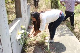 同学们人手一束鲜花,面向地质陵园,三鞠躬,默哀一分钟,全体同学举起右手,庄严宣誓:“我立志做一名合格的地质人,学习和弘扬地质先辈的爱国主义精神,自强不息,团结友爱。从现在做起,从身边做起,从小事做起,为祖国,为人民,为地质事业做出自己的贡献”,铿锵的誓言在陵园上空久久回荡。在老师们的带领下,学生们依次向地质革命先烈敬献鲜花,并进入陵园瞻仰了先烈们的墓志铭。