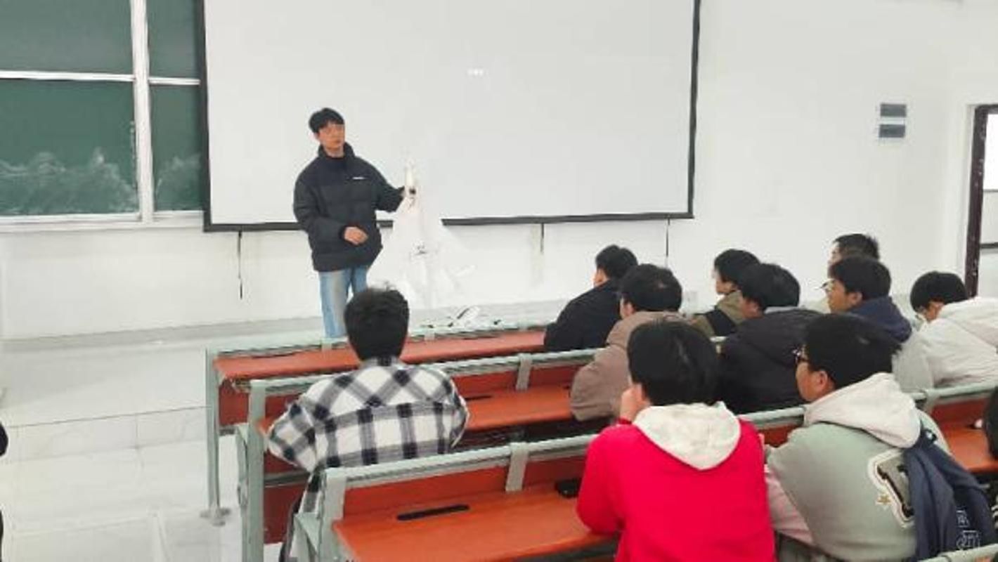 实验室参观结束后,科普知识讲解环节在睿知楼118教室开展。航模队骨干成员以“航模基础与专业应用”为核心,从航模基本概念、常见分类、核心组成结构及飞行力学原理等基础内容切入,层层递进讲解航模技术与飞行器制造、动力工程两大专业的知识关联与实践融合要点。同时,现场科普航空飞行安全规范、航模入门学习方法与进阶路径,并系统介绍中国国际飞行器设计挑战赛(CUADC)等国内外专业赛事的赛事规则、参赛要求与备赛要点,帮助同学们搭建起航模领域的知识框架,明晰专业学习与科创实践的结合方向。