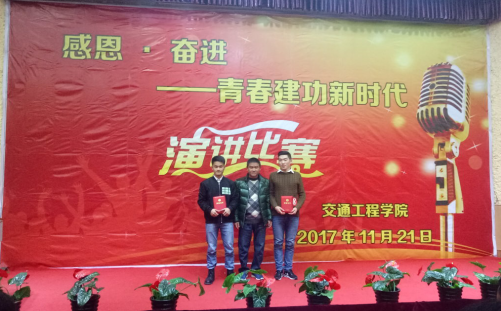本网讯(交通工程学院 陈科文/图 李成进 黄秀明)为学习贯彻十九大精神,不忘初心,牢记使命,学习新思想、确定新目标、开启新征程,2017年11月25日晚,交通工程学院在逸夫小礼堂举办了以“感恩 奋进—青春建功新时代”为主题的演讲比赛。