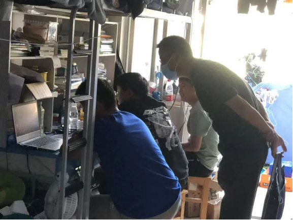 9月8日,在第二次抗原检测中,六号公寓401寝室发现检测4次仍是双杠的学生,周伟立刻协调该学生进入隔离室。为了稳定学生的情绪,周伟随即进入寝室,与寝室余下4人、志愿者4人,共9人在401同住进行隔离。“在心慌的时候,周伟老师和我们一起,顿时感觉有了主心骨!”一同隔离的陈祖奥同学说道。