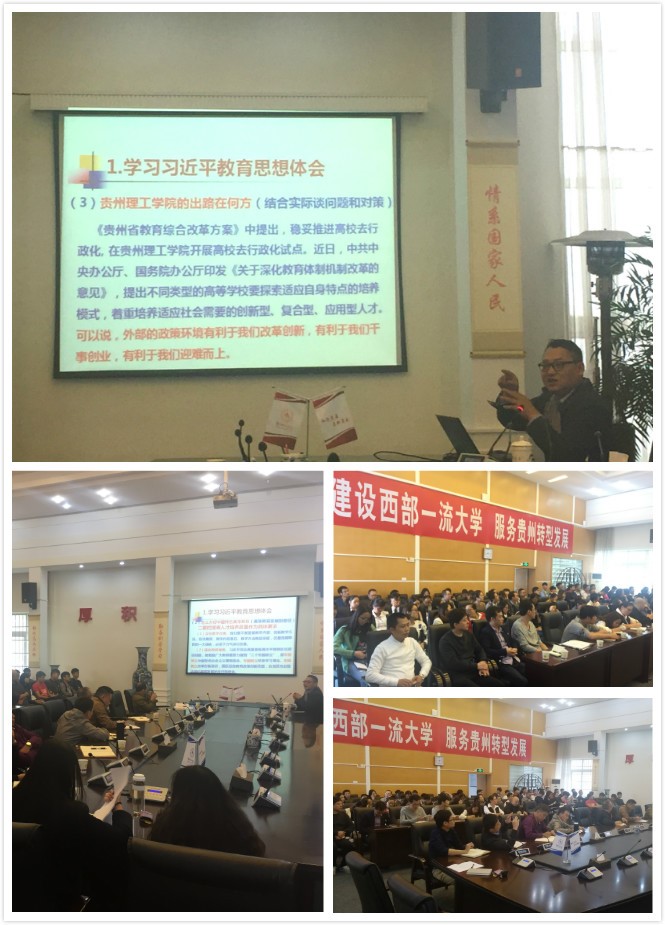 宋建波以学习习近平教育思想体会为切入点,阐述了对中国特色高等教育的认识和思考。从贵州实施“工业强省”战略的历史背景出发,介绍了贵州理工学院的办学定位、历史使命以及特色发展模式,从学校顶层设计的战略高度阐述了对学校事业改革发展的深入思考。并对“学科-专业-平台-团队”一体化建设工程、政产学研用联合办学工程、中外合作办学工程等内容进行详细解读。他指出,办好理工的事情一是不忘初心,扎根贵州办大学;二是不换频道,矢志不渝创新篇;三是不遗余力,撸起袖子加油干;四是不辱使命,牢记嘱托在心间。