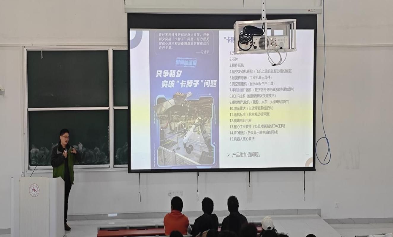 徐佳文以我国在芯片、示波器等领域不断突破外国技术“卡脖子”难题为切入点,生动展现了国家科技自立自强的坚定步伐与时代机遇,让在场学子深刻感受到科技强国背景下青年一代的责任与使命。他结合当前就业市场的新形势,深入分析了大学生面临的就业挑战与发展机遇,强调在行业迭代加速的背景下,清晰的职业规划是应对不确定性、实现个人价值的核心竞争力。