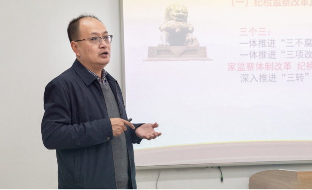 本网讯(大数据学院)11月29日晚,大数据学院“一院一品”之廉洁文化讲座在贵安校区知行楼G3302教室举行。贵州理工学院纪委副书记叶栋国应邀以“正确认清反腐败形势 扣好人生第一粒扣子”为题宣讲党的二十大精神。讲座由党总支书记张艳主持,党总支副书记武斌、学生党员代表和部分2023届毕业生参加讲座。