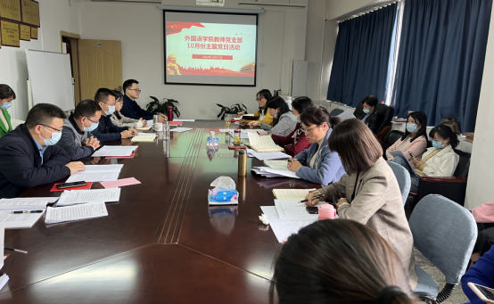 本网讯(外国语学院 张郁佳)2022年10月21日,外国语学院教师党支部在行政楼1102会议室开展了以“我为群众办实事”为主题的十月主题党日活动。活动由教师党支部书记冯建平主持,外国语学院全体党员参加。校党委委员、纪委书记、监察专员贺梦依出席指导。