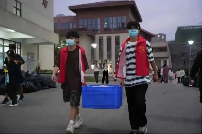 学生党员吴攀、廖洪鑫帮忙搬运物资