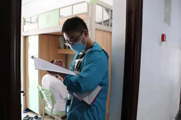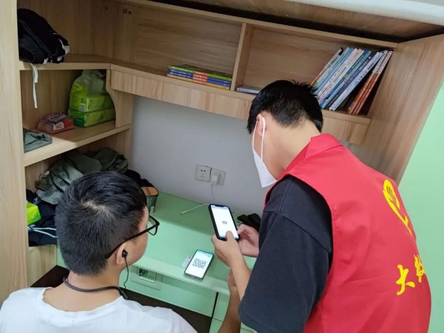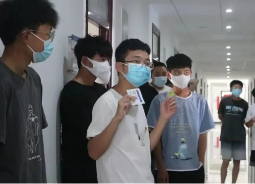 在核酸检测采样点,学生党员主动帮助维持现场秩序,查看健康码,做好宣传动员,细心提醒前来检测的同学戴好口罩,注意“一米”间距。抗原检测时,学生党员做好个人防护,走入学生寝室,逐一扫码登记,耐心解说自查方法,仔细查看检测结果,确保全覆盖、无遗漏。一个个身穿红马甲的学生党员用一抹抹鲜亮的“党员红”守护着校园里的“健康绿”。