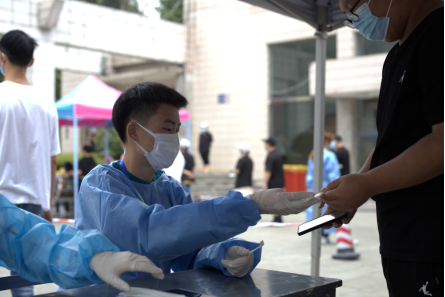 志愿者周浩引导同学扫核酸条形码与发放棉签