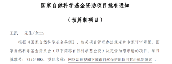 近日,国家自然科学基金委公布了2022年度国家自然科学基金项目评审结果,学院党总支副书记王凯教授的《网络治理视阈下城市自然保护地协同共治机制研究》项目成功获批,喜获国家自然科学地区基金项目立项支持。