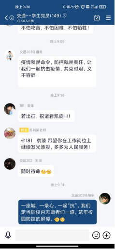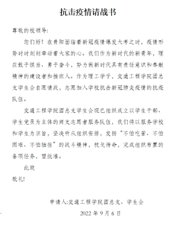 会前,交通工程学院学生以学院团总支、学生会名义向校学工部、校团委提交了“抗击疫情请战书”。周伟结合参与蔡家关校区抗疫一线的工作提出要求和希望:“抗击疫情请战书”彰显了交通青年学子勇于担责、敢于奉献的向上品格,希望同学们要在枕戈待命随时参与抗击疫情的工作中真正得到锤炼,要将思政课程和课程思政中的所学转化为抗疫行动中的力量,在配合学校抗疫工作中主动思考、主动作为,快速成长。同时,在抗疫期间的日常学习生活中,不断加强自律,带头做好表率,用正确的思想引导积极的行动,以榜样的作用营造向上的氛围,充分发挥在广大青年学生中的旗帜作用。