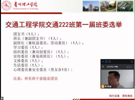 各班班主任和学生还分别召开班会选举班委,召开疫情专题会议,各班主任通过带领同学们学习“学习手册”上有关学生管理的相关制度和文件,如《贵州理工学院学生行为规范》《贵州理工学院学生管理规定》《贵州理工学院学生宿舍管理规定》等,帮助同学们调整心态,安心学习。