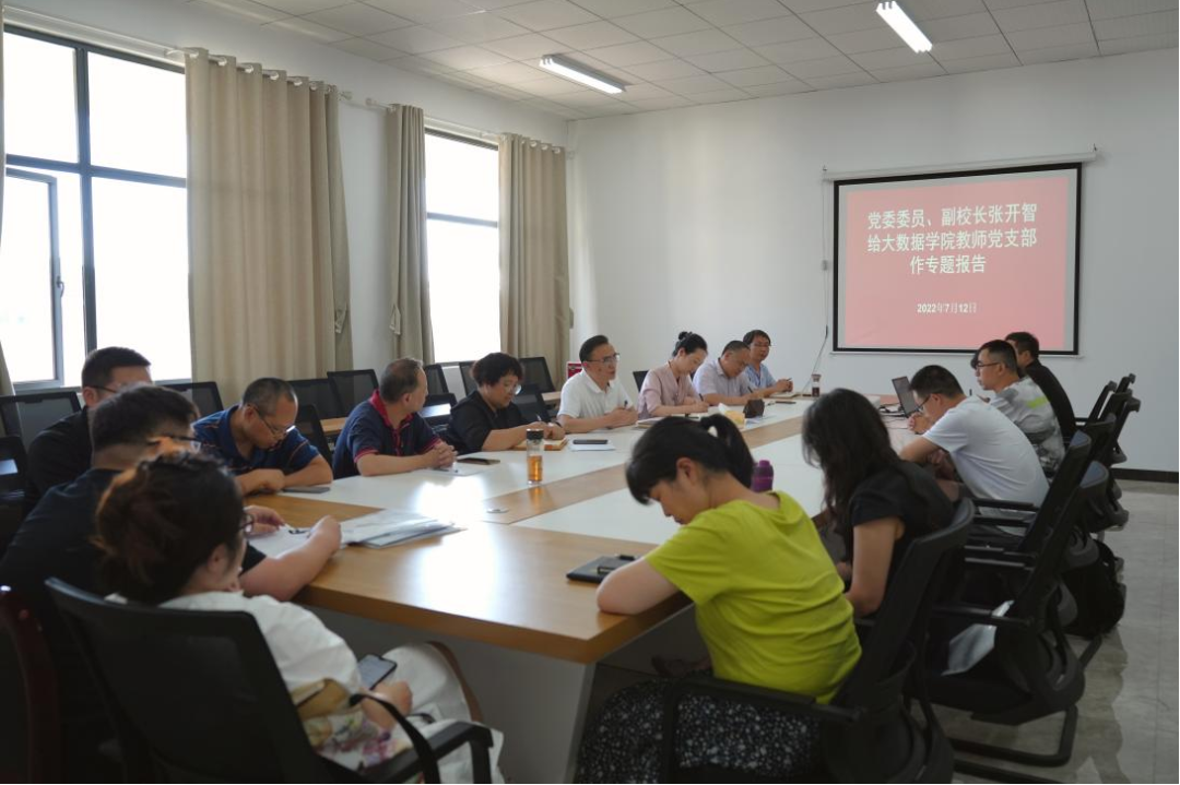 本网讯(大数据学院)2022年7月12日下午,党委委员、副校长张开智到联系的大数据学院教师党支部,以“抓住机遇,鼓足干劲,在大数据学院奋力崛起中建功立业”为题作专题报告。支部书记杨楠主持会议,院领导张艳、肖迎群、武斌、杨仁增及支部党员参加会议。
