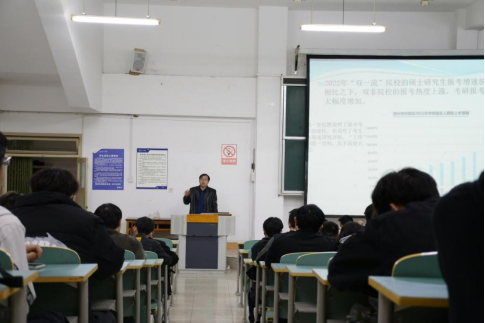 蔡诚以“勇往直前,成为创新型人才”为主题拉开本次交流会序幕。在对《2022年全国研究生招生调查报告》进行数据分析后,结合国家对当代青年的要求,他激励学子们成为“有志气、有骨气、有底气,能够担当时代重任”的新青年,努力考上研究生为成为创新型人才打下坚实基础。