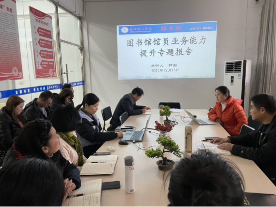 本网讯(图书馆李幸/文,胡应龙/图)为进一步提高全体馆员的理论素养和业务能力,12月16日上午,图书馆组织开展了馆员业务专题培训。本次培训由图书馆馆长林蔚主讲,全体馆员参加。