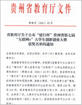 本网讯(大数据学院 文/武卓田)近日,省教育厅公布了“建行杯”贵州省第七届“互联网+”大学生创新创业大赛获奖名单,大数据学院网络193班安炉明同学所在团队项目“黑重晶石变白及改性—产品技术服务提供商”获高教主赛道金奖;大数据181班刘智海所在团队项目“智慧菌落辨识器”,大数据181班李文杰、尹雪、大数据191班王培红、大数据183班李钰、钟启华、黄启龙、邱波7名同学所在团队项目“种呗—智能分析种植平台”获高教主赛道银奖;大数据181班吴慧雯、刘德福、黄孝祥、智能181班周亚鹏、刘昕蕊、代章涛、大数据191班董博阳、牛龙星8名同学所在团队项目“家一下”获高教主赛道铜奖;大数据181班张念涛、智能181班周咏煊2名同学所在团队项目“红设计—做红色文化传播的先锋”获“青年红色筑梦之旅 ”赛道银奖。学院党员教师杨剑锋、王喜宾、石春梅参与项目指导,所指导项目分获高教主赛道银奖、铜奖。