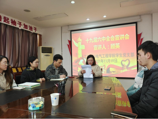 本网讯(人工智能与电气工程学院 孟丽丽/文 郑玉娇/图)为学习贯彻十九届六中全会精神,11月19日,在主楼723会议室,人工智能与电气工程学院学生党支部组织开展“学习中共中央关于党的百年奋斗重大成就和历史经验的决议”主题党日活动,会议由学生党支部书记郑玉娇主持,学生科科长顾英、学生党支部全体党员参会。