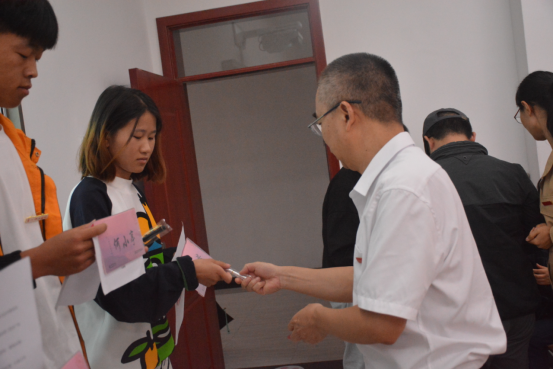 学院领导、老师为学生授笔赠送桌牌校牌,并合影留念。