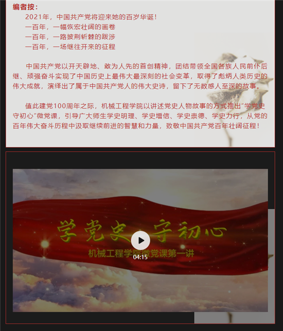 学习百年党史,汲取奋进力量。当前,机械工程学院将以国家级一流本科专业建设点为契机,大力推进教学工作,强化专业内涵建设和师资队伍建设;以“既要仰望星空,又要脚踏实地”的院训精神,将党史学习教育过程中激发出来的信心和热情,转换为推动学院各项事业发展的强大动力和实际成效,促进学院各项工作迈上新台阶,让师生切实感受到党史学习教育带来的新变化、新气象,以优异的成绩庆祝中国共产党建党100周年。