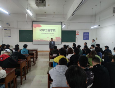 本网讯(化学工程学院 谢专/图文)为了进一步提高化学工程学院能源专业学生的考研热情,明确考研目标,掌握相关考研备考技巧,了解更多考研择校信息,4月28日下午,化学工程学院在三教113教室开展了新能源科学与工程专业考研交流会,活动邀请到了该专业2017级考研成功的赖妞、吕亚敏两位同学为大家做考研经验交流,化学工程学院党总支副书记蔡诚、能源191班主任吉玉碧教授、仇伟副教授出席,2019级新能源科学与工程专业全体同学参加交流。