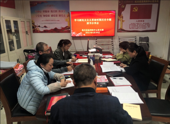 (本网讯 信息网络中心 莫紫娟)2021年4月28日,机关信息网络中心党支部在中心一楼会议室组织党员同志开展了“学习新明民主主义”主题教育读书分享会,高应波同志领学《中国共产党简史》之《第一次国共合作和大革命高潮的兴起》、《北伐战争和工人运动》、《全民族抗日战争的中流砥柱》、《夺取新民主主义革命的全国性胜利》。随后党员同志交流发言。高应波同志分享学习心得,强调要牢记党的理想信念、明确目标,牢记党的实践创造、担当作为,深刻领会党史的内涵。随后大家纷纷作交流发言,分享学习心得体会。