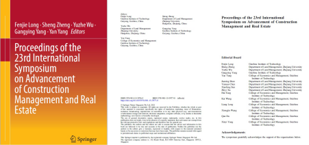本网讯(经济管理学院 唐惠/文图)近日,由我校2018年主办的第二十三届建设管理与房地产发展国际学术研讨会论文集,由德国斯普林格出版社(Springer-Verlag)同时以纸质书和电子书两种版本出版。