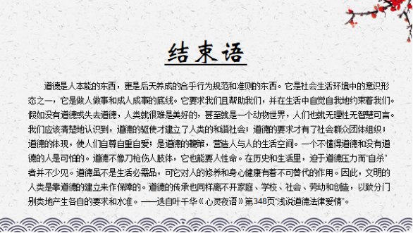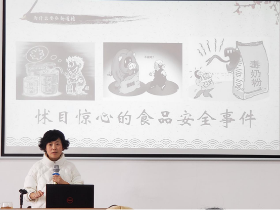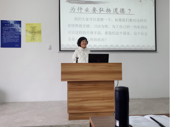 唐丽华以当今社会道德的现状为序,从“什么是道德”“为什么要弘扬道德”“怎样弘扬道德”几个方面进行讲解。她强调,道德是人本能的东西,更是后天养成的合乎行为规范和准则的东西。它是社会生活环境中的意识形态之一,是做人做事和成人成事的底线。倡导同学们以身作则,用自己的一言一行践行道德规范并大力弘扬,要以德为荣、以德为美、健康向上,要积极创造人与人之间礼尚往来、以礼相待、和谐相处、和睦共存的良好的生存氛围和社会氛围。