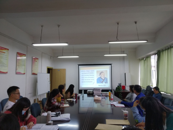 会议首先进行第二期中国传统文化英语说网络微课展播。来自第二教研室的两位党员教师徐丽丹和韦唯分享了精心制作的以“中华教育家”为主题的微课,详细介绍了陶行知和孟子的教育理念和著作。希望通过一系列的课程思政微课能够提升学生对中国文化的兴趣,加深学生对中国文化的理解,增强文化认同感和文化自信。