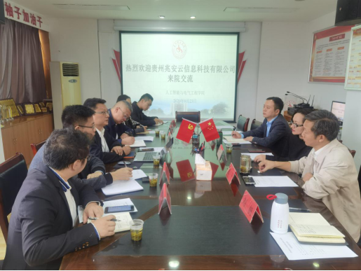 本网讯(人工智能与电气工程学院 刘帆/文图)2020年9月23日上午,贵州兆安云信息科技有限公司董事长赵钢、总经理陈光孟一行6人来院交流。学院党总支书记王婷婷、副院长龙飞、人工智能与智能控制特色重点实验室主任霍雨佳及相关人员参加了此次交流会。会议由副院长龙飞主持。