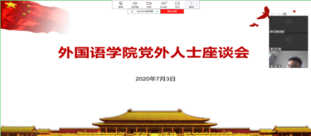 本网讯(外国语学院 冯建平/文 王艳/图)为充分发挥统一战线作用,更好开展学院统战工作,7月6日下午,外国语学院通过WeLink视频会议系统召开党外人士座谈会,征求大家对学院改革发展的意见和建议。学院党总支部分班子成员、民主党派和无党派教师代表(两名)参加座谈会,会议由党总支副书记程超同志主持。