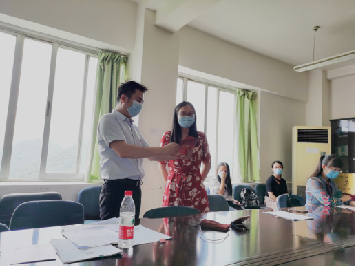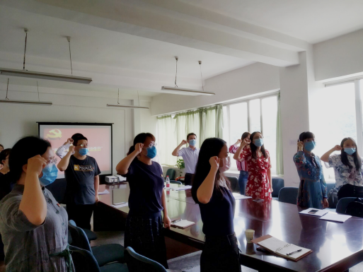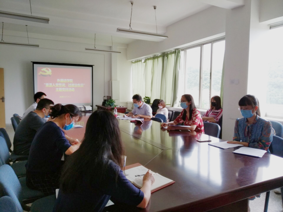 本网讯(外国语学院 彭立飞/文 王艳/图)为庆祝中国共产党建党99周年,进一步增强党员身份意识、责任意识,谨记党员权利和义务,牢记“政治生日”,7月1日下午,外国语学院教师党支部在行政楼1102会议室开展了“重温入党誓词、过政治生日”主题党日活动。支部全体党员参加本次活动,重温入党誓词,对照入党誓词找差距,深入交流思想体会。学院党总支副书记程超主持活动。
