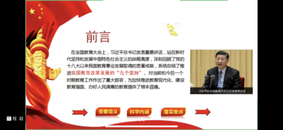 党课主要内容包括三个方面:教育改革发展“九个坚持”的重要意义、“九个坚持”的科学内涵以及“九个坚持”的贯彻重点。“九个坚持”深刻回答了培养什么人、怎样培养人、为谁培养人这一根本问题,思想深刻、内涵丰富,是我们党对我国教育事业规律性认识的深化,是我们党在实践基础上的理论创新成果,是习近平新时代中国特色社会主义思想的重要组成部分,来之不易,必须始终坚持并不断丰富发展。