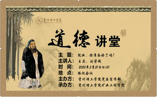 本网讯(矿业工程学院 司霜)为进一步做好2017级学生就业指导工作,让同学们了解当前就业形势,端正就业心态,提前做好规划和相应准备,矿业工程学院于2020年5月21日通过腾讯会议开展道德讲堂活动,学院党总支副书记王庆和辅导员刘芳诚为同学们进行宣讲。