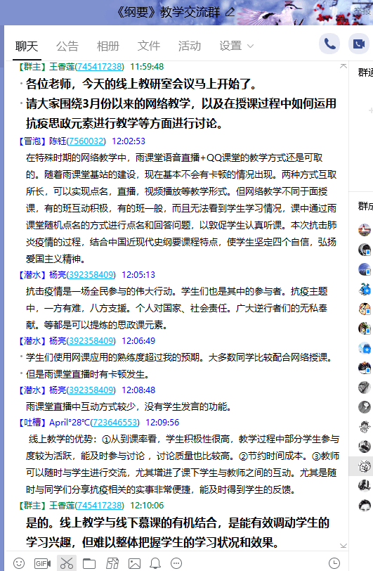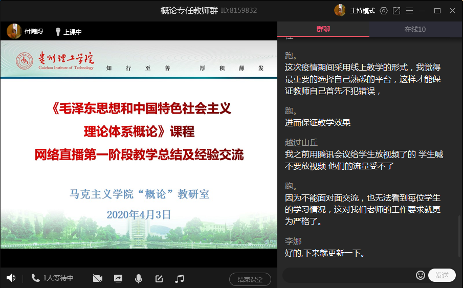 本网讯(马克思主义学院 首兰兰/文)为提高思想政治理论课网络教学实效,搭建疫情期间思政老师互相交流、探讨平台,2020年4月3日,马克思主义学院《概论》教研室、《纲要》教研室以线上讨论的形式分别开展网络教学总结研讨活动。活动由各教研室负责人主持。