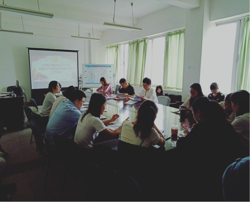 本网讯(大学外语教学部 魏念)4月26日上午,大学外语教学部组织召开2019年全面从严治党暨党风廉政建设工作会议,会议由党总支纪检委员吉胜芬主持,大学外语教学部全体教职工参加。
