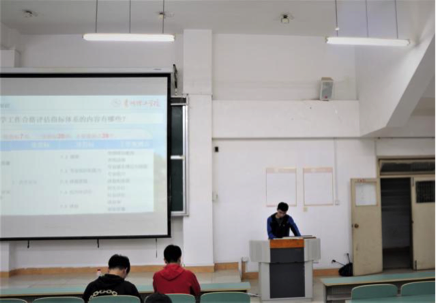 宣讲员表示,我校在迎接评估的同时,也在认真落实学风建设、校风建设,完善管理体系。在本科教学工作合格评估指标体系中,学生涉及最多的是教学质量。教学质量的高低,是以实施培养方案的效果,能否达到预定的培养目标来衡量。