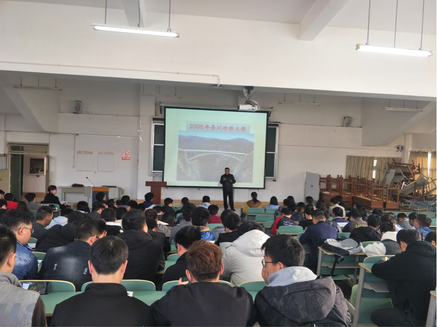 娄锋一改传统讲座模式,结合自身经历,以谈心的方式向在场师生讲述他从事本专业的经验和感想,更凭借其丰富的工作经验和过硬的专业技术获得阵阵掌声。讲座中,他向在场师生介绍了自己参与设计过的桥梁及其它典型的桥梁,如净跨120米的钢筋混凝土拱桥——务川珍珠大桥,贵阳二环花溪大桥,港珠澳大桥等。他从桥梁的设计到施工,以及施工时遇到的问题、原因及解决措施一一谈起,让大家学习到很多前沿的专业知识。