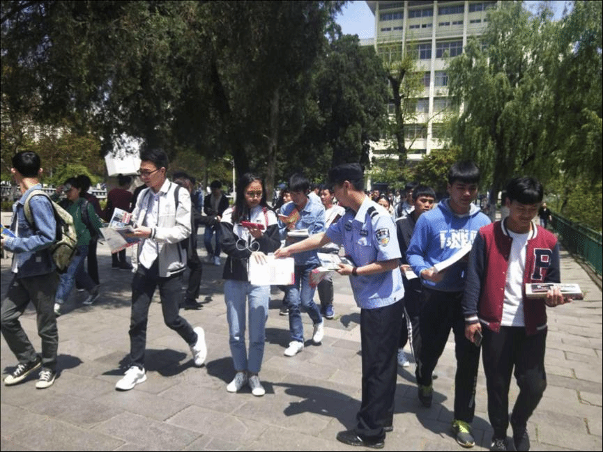 4月11日,学校联合所在地辖区派出所、社区,组织学生护校队在教学楼附近向师生发放国家安全宣传资料,开展国家安全知识宣传。