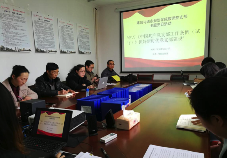本网讯(建筑与城市规划学院 胡婷)为使广大党员深入领会《中国共产党支部工作条例(试行)》精神,全面掌握《条例》内容,抓好新时代党支部建设,12月21日,建规学院教师党支部组织全体党员开展了学习《条例》主题党日活动。