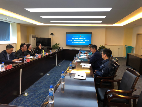 本网讯(电气与信息工程学院 王开丽)为积极响应国家关于加强学校与企业合作的号召,充分发挥双方优势,更好的为企业、为社会培养高素质、高技能的应用型人才,同时也为大学生实习、实训、就业提供更多空间,5月10日上午,我校电气与信息工程学院与贵阳海信电子有限公司举行“实习基地”签约挂牌仪式。电气与信息工程学院副院长张均、贵阳海信电子有限公司党委书记温洪刚出席签约仪式。