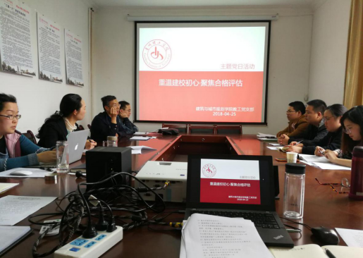 本网讯(建筑与城市规划学院颜政纲)为进一步深入贯彻落实党的十九大精神,提高运用习近平新时代中国特色社会主义思想武装头脑、指导实践、推动工作的能力和本领,做好迎接教育部本科教学工作合格评估相关准备工作,4月25日下午,按照学校党委组织部的统一要求,建筑与城市规划学院教工党支部在学院会议室组织开展“重温建校初心、聚焦合格评估”主题党日活动。教师党员、教师代表及学生入党积极分子、发展对象等参加活动。