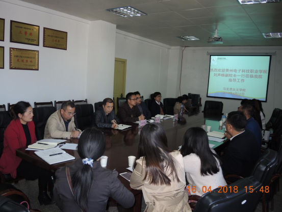 本网讯(马克思主义学院 张建军)4月16日下午,贵州电子科技职业学院副院长刘声扬一行到我校马克思主义学院调研交流,马克思主义学院院长敖以深、党总支副书记王忠奎、副院长欧阳德君以及部分教师参与了交流座谈。