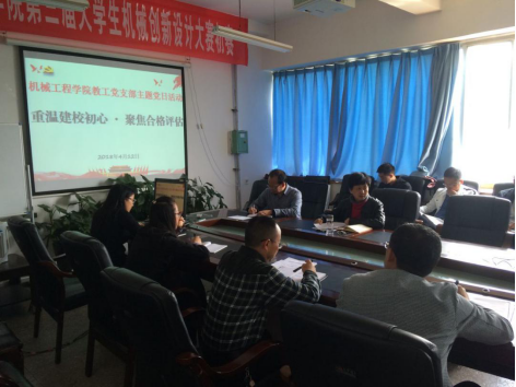 本网讯(机械工程学院 吴艳英)2018年是贯彻党的十九大精神的开局之年,也是贵州理工学院建校5周年,更是贵州理工学院迎接教育部普通高校本科教学工作合格评估的关键之年。为进一步深入贯彻落实党的十九大精神,提高运用习近平新时代中国特色社会主义思想武装头脑、指导实践、推动工作的能力和本领,做好迎接教育部本科教学工作合格评估相关准备工作,4月12日下午,机械工程学院开展“重温建校初心·聚焦合格评估”主题党日活动,机械工程学院全体教职工参加。受机械工程学院党总支书记熊远兴委托,机械工程学院院长陈海虹主持此次党日活动。