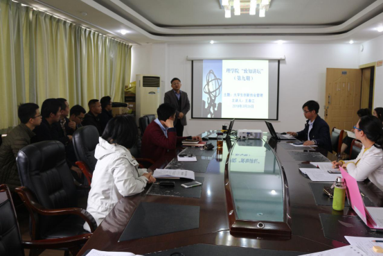 本网讯(理学院 张梦)3月26日中午,理学院第9期“致知讲坛”在学院会议室举行,副院长王春江研究员担任主讲嘉宾,以“大学生创新创业管理”为题与大家分享了自己的研究心得。