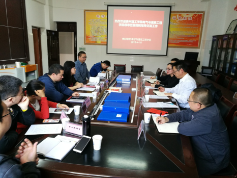 本网讯 (电气与信息工程学院 刘帆)为进一步做好学院本科教学合格评估建设工作,4月18日上午,电气与信息工程学院党总支书记王婷婷、副院长张均带领学院评建办老师一行赴贵阳学院电子与通信工程学院调研学习该院在本科教学合格评估方面的先进经验,该院党总支书记高新、院长陈雨青、党总支副书记李旭、副院长彭晓珊以及相关部门负责人热情接待了我校一行。