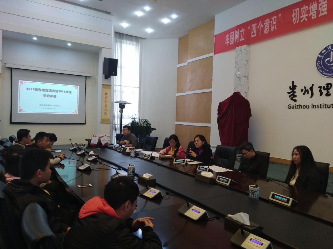 本网讯(食品药品制造工程学院 田兴国)2018年3月5日中午,新学期开学第一天,食品药品制造工程学院在喀斯特会议厅组织召开考研交流和动员大会。学院党总支书记周红、院长张振、副院长黄名正出席大会,学院辅导员及14级、15级考研学生参加了本次大会。