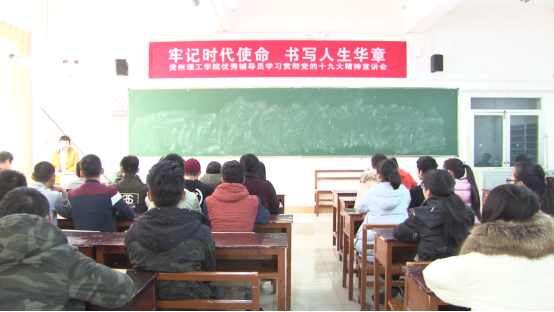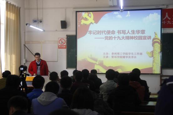 2017年12月28日,贵州理工学院优秀辅导员“党的十九大精神”校园宣讲会在三教114举行。我校优秀辅导员李永老师作为主讲人为资环学院学生代表宣讲党的十九大精神。