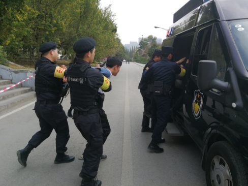 当天中午11时,2名手执砍刀的“暴恐分子”在我校采矿楼至第二教学楼路段伺机作案,被治安三号岗值守人员发现,及时向保卫处报告。保卫处人员闻讯后,迅速调集校园应急处置队员携带安保装备,赶赴现场进行处置。到达现场后,保安队员成功将2名“暴恐分子”控制在第二教学楼门前。经过十余分钟的搏斗,成功将2人制服,随后交辖区派出所民警带走。