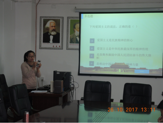 王帅还通过“雨课堂”在“爱国主义与爱社会主义”这一重难点章节教学中的运用,现身说法,为参会教师进行教学示范。讲授过程中,知识点明确,逻辑清晰,语言生动形象,案例丰富,“雨课堂”中插入单项(多项)选择题、投票题,点名、弹幕、试卷、课后作业及批改等多样的功能得到广泛应用。老师们纷纷表示,此次教学研讨活动受益匪浅,启发很大,在教学中,应进一步注重理论讲授和学生实际紧密结合,教学内容与多种教学形式相结合,促进教学效果的达成。
